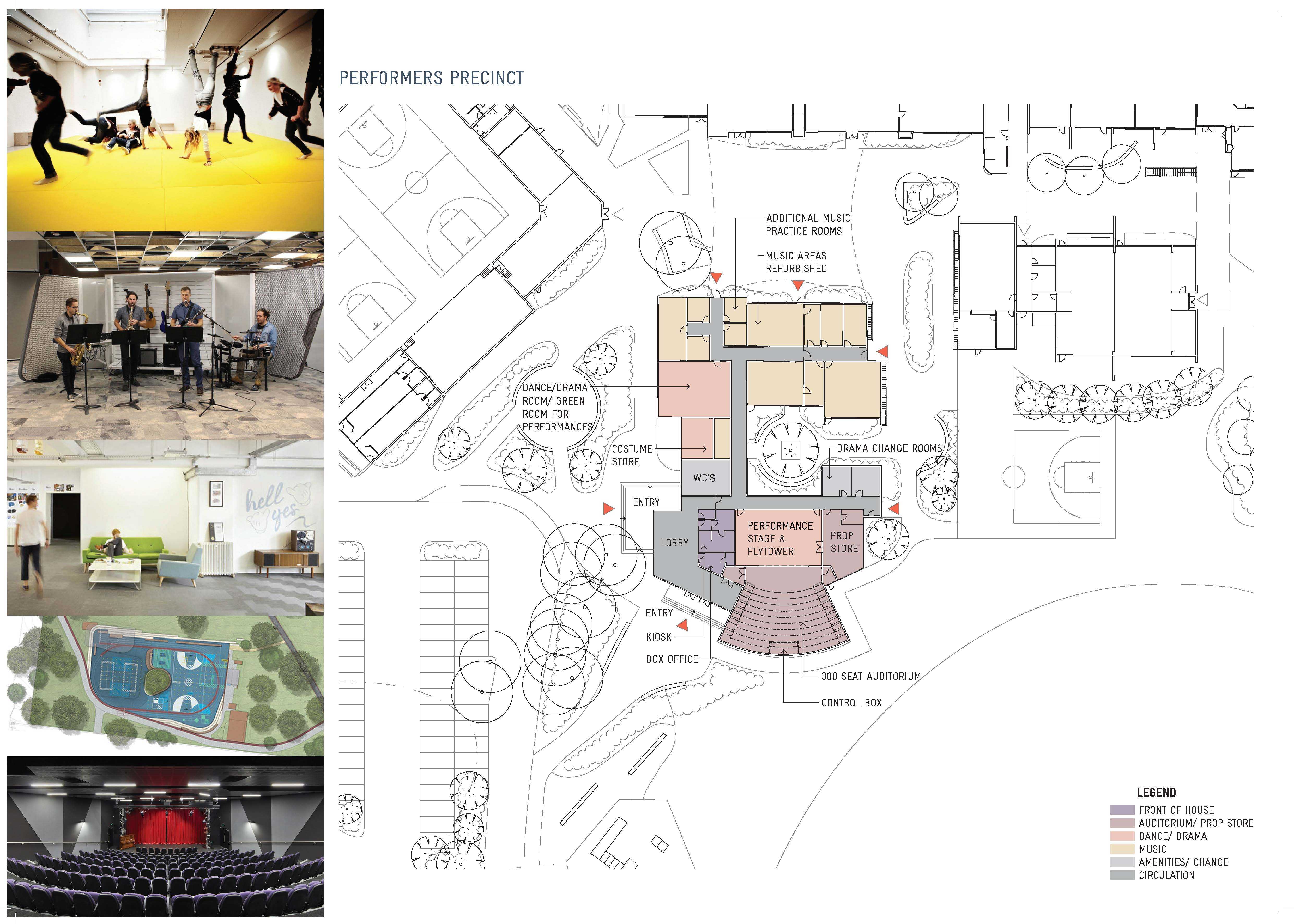 The first phase of the project includes administration upgrades (which were completed in January 2020) and a new music and performing arts centre with a 300-seat theatre and an increased number of music practice rooms to accommodate the growing number of music students. Additionally, phase one will upgrade the vehicle and pedestrian network, including improved bus flow and a welcome road connection to Peart Street with increased parking.